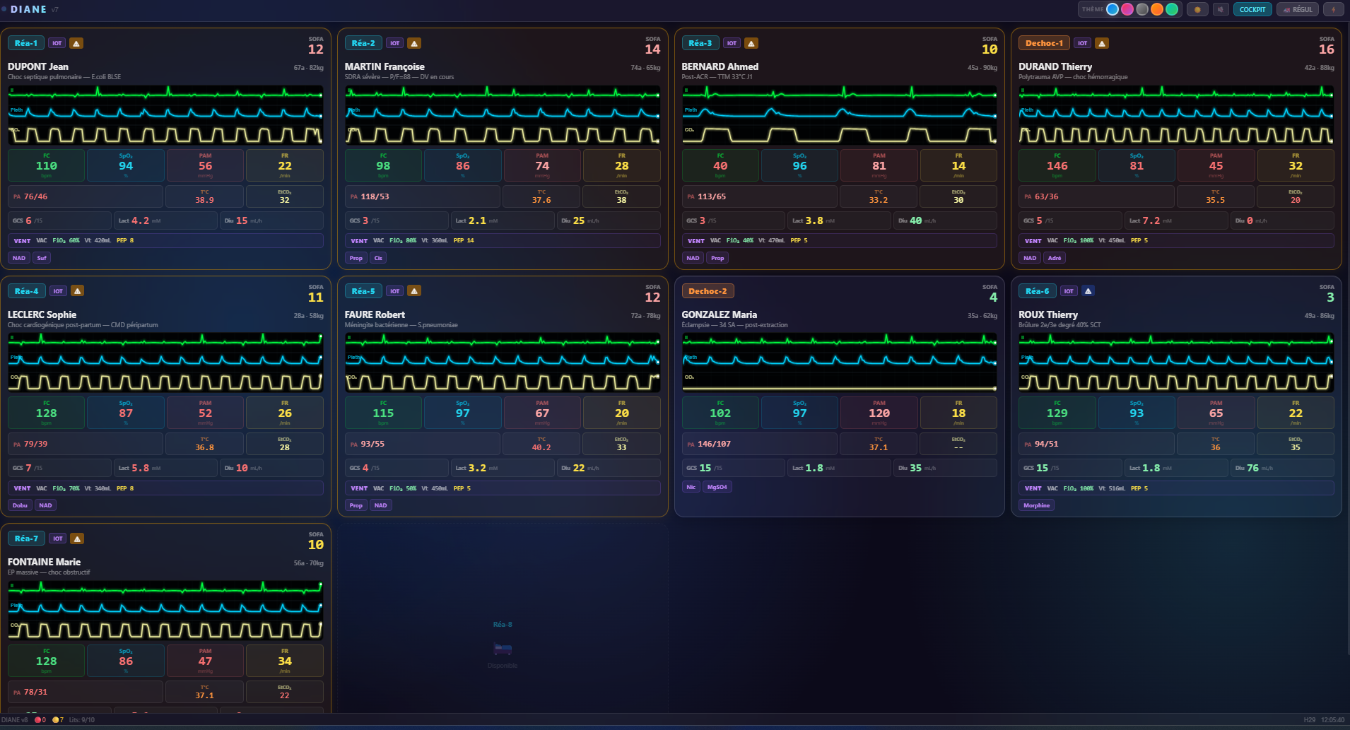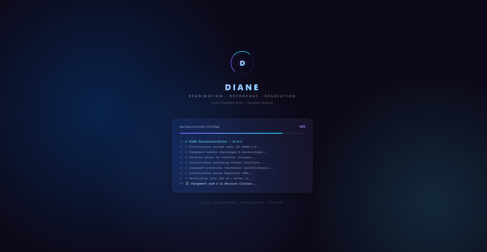 DIANE Simulateur est une simulation médicale "serious game" ultra-réaliste qui vous place aux commandes d'un service de Réanimation et de Déchocage, couplé à la Régulation du SAMU. Ce n'est pas un simple jeu de gestion : c'est un moteur physiologique et pharmacologique pointu conçu pour tester votre raisonnement clinique face à des urgences vitales absolues.