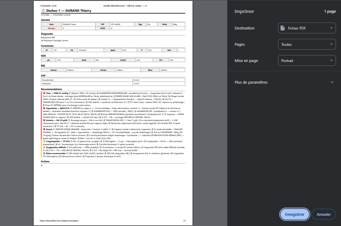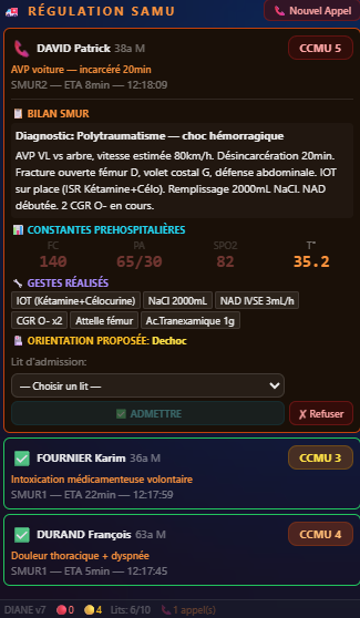 DIANE Simulateur is an ultra-realistic medical "serious game" that puts you in charge of an Intensive Care Unit (ICU), a Trauma Bay, and EMS (SAMU) Dispatch. This isn't just a management game: it's a deep physiological and pharmacological engine designed to test your clinical reasoning in the face of absolute life-threatening emergencies.